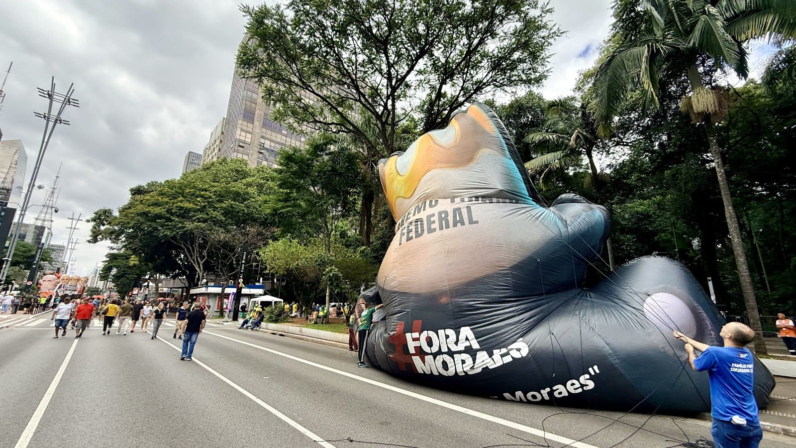 Imagens do local mostram a presença de bonecos infláveis que criticam integrantes do Supremo Tribunal Federal (STF) e o governo federal. Um dos infláveis exibe a frase “Fora Moraes”, referindo-se ao ministro Alexandre de Moraes. Outro inflável traz a inscrição “Falem por mim”, representando o ex-presidente Jair Bolsonaro.