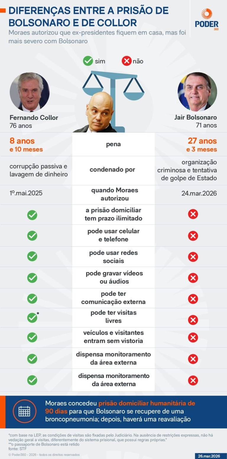 No dia 24 de março, o ministro Alexandre de Moraes autorizou a prisão domiciliar humanitária de Jair Bolsonaro, que possui 71 anos. Esta decisão incluiu medidas cautelares mais rigorosas em comparação às impostas a Fernando Collor, que tem 76 anos e recebeu a mesma medida em maio de 2025. As condições de Bolsonaro envolvem restrições severas em relação à comunicação e visitas.