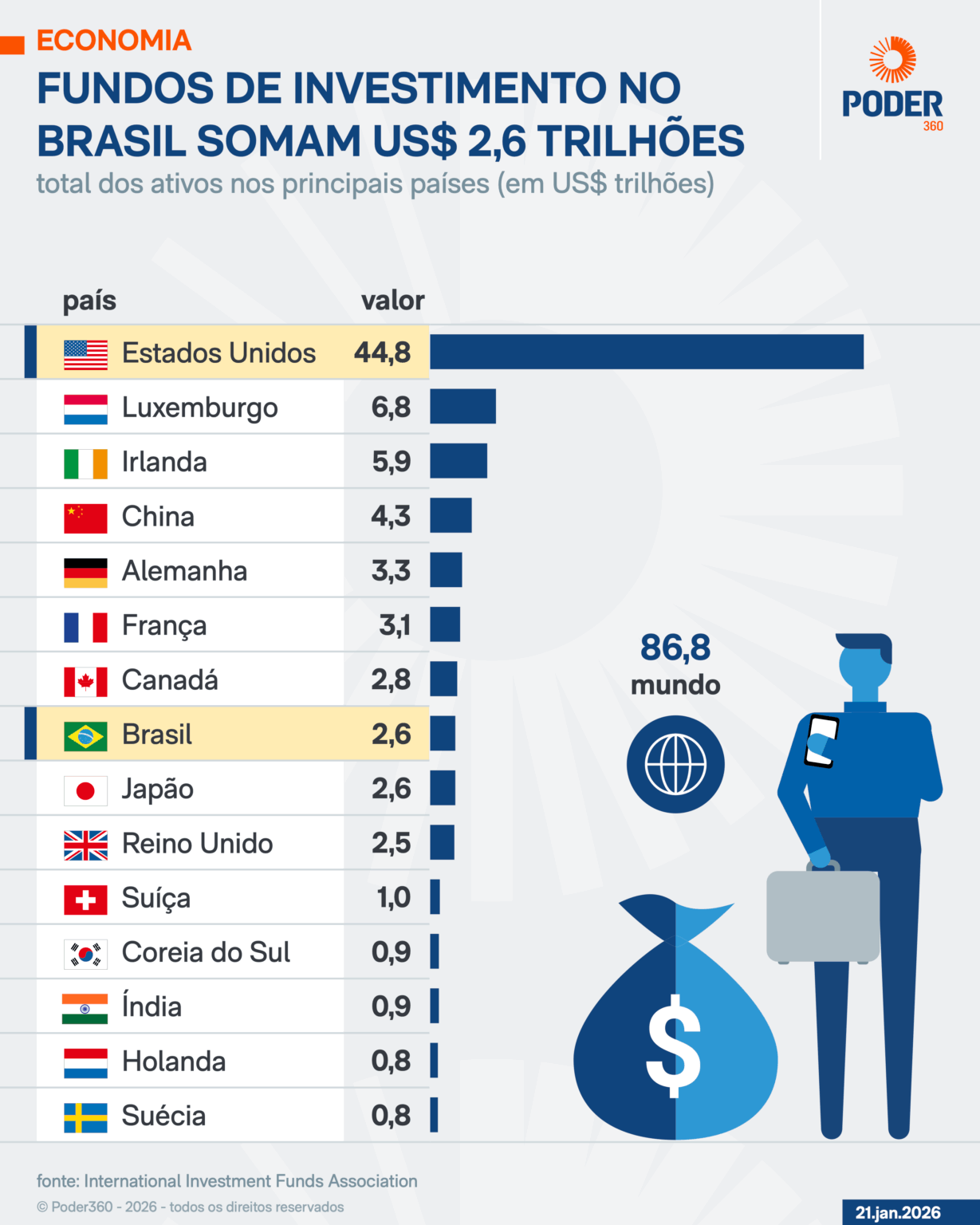 O valor total disponível em fundos no Brasil é de aproximadamente US$ 2,6 trilhões, o que representa cerca de 3% do total de ativos em fundos no mundo, que é de US$ 86,8 trilhões. Em comparação, os Estados Unidos concentram uma quantidade significativa, com US$ 44,8 trilhões, ou 51,7% do total global, destacando a diferença de escala entre os dois mercados.