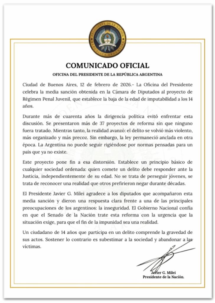 Em um comunicado, o presidente Milei expressou sua satisfação com a aprovação e agradeceu aos deputados que apoiaram a proposta, afirmando que um jovem de 14 anos que comete um crime compreende a gravidade de seus atos, argumentando que não reconhecer isso seria uma forma de subestimar a sociedade e desconsiderar as vítimas.