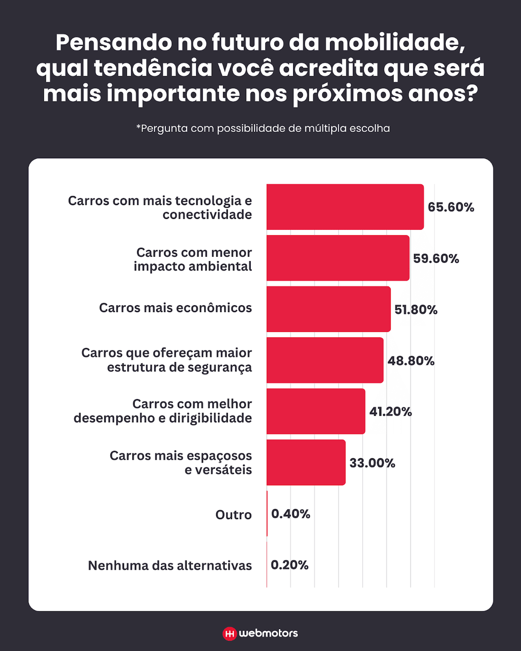 Os resultados da pesquisa também mostram um consumidor brasileiro alinhado com a tendência global de mobilidade inteligente e sustentável. Carros elétricos estão se tornando cada vez mais desejados, deixando de ser uma exceção no mercado.