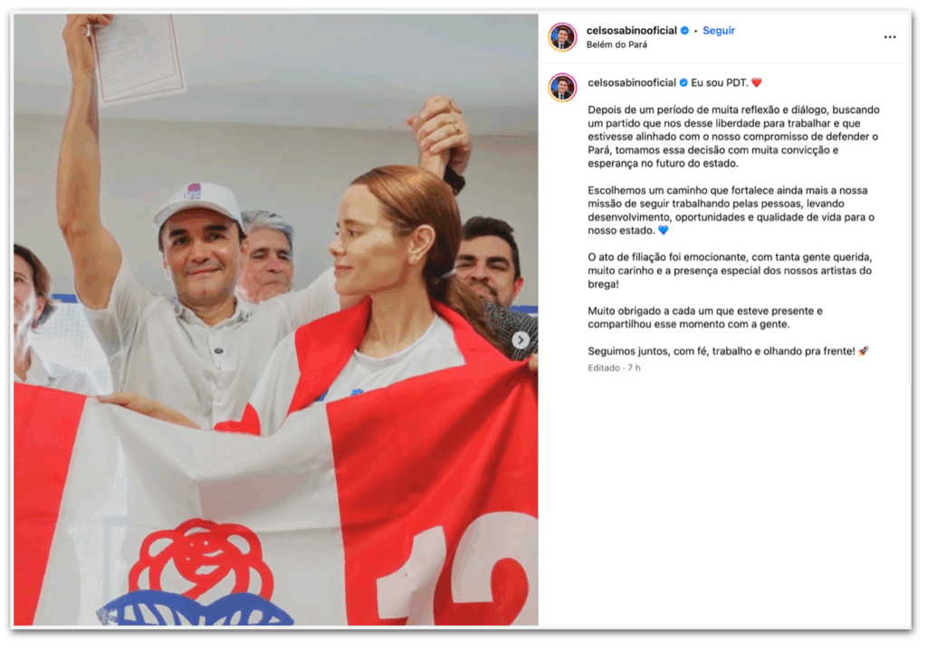 Celso Sabino destacou que sua escolha pelo PDT foi resultado de um período de articulação política e diálogo. Em suas redes sociais, ele afirmou que a legenda está em sintonia com seus objetivos de defender os interesses do Pará e expandir sua base eleitoral.