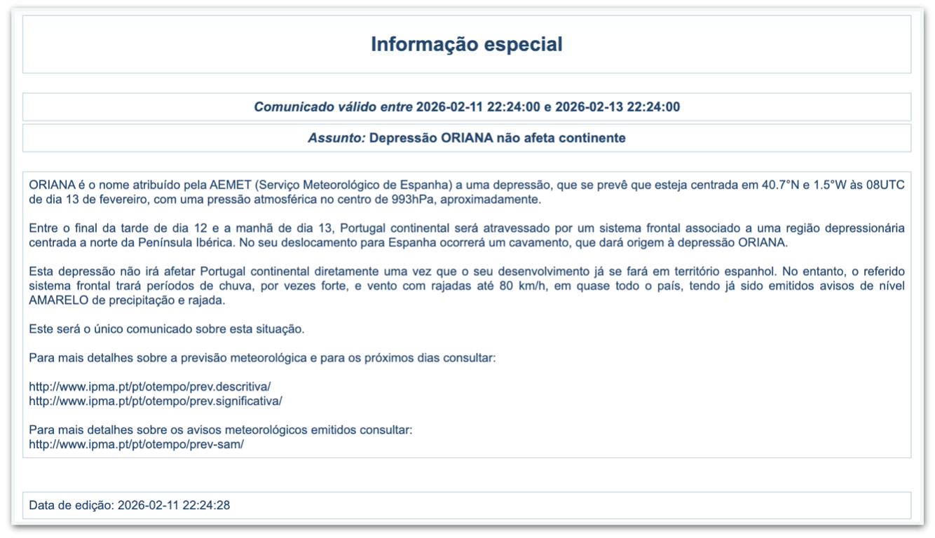 Na quarta-feira, 11 de fevereiro de 2026, o Instituto Português do Mar e da Atmosfera (IPMA) alertou que a depressão Oriana, embora não tenha atingido diretamente o país, traria chuvas fortes e ventos de até 80 km/h, resultando em avisos de nível amarelo para precipitações e rajadas.