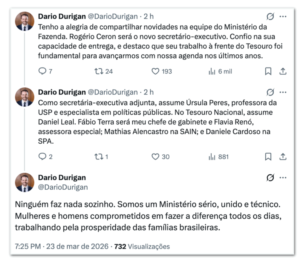 O ministro da Fazenda promoveu uma reestruturação na sua equipe, resultando na saída de Rogério Ceron da Secretaria do Tesouro Nacional, onde esteve por três anos. O novo secretário-executivo, Daniel Leal, que anteriormente ocupava a subsecretaria da Dívida Pública, assume agora o comando do Tesouro.