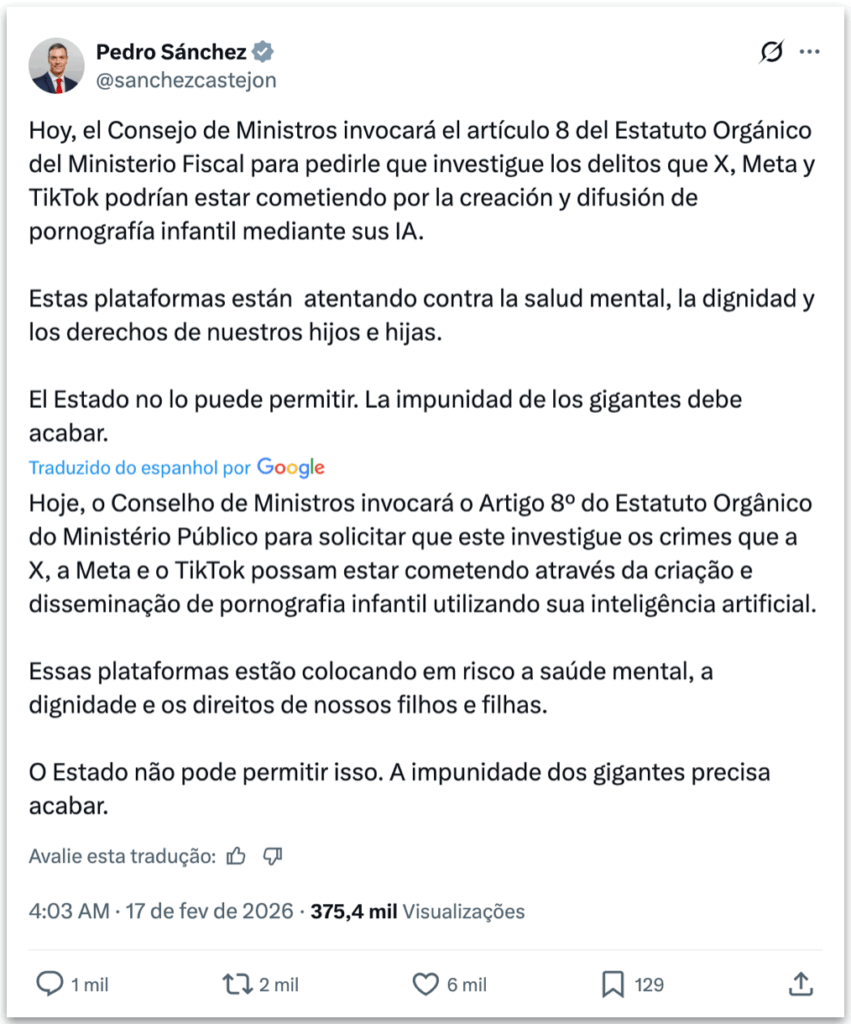 O governo da Espanha deu início a uma investigação sobre as plataformas X, Meta e TikTok, focando na criação e disseminação de conteúdos relacionados ao abuso sexual infantil gerados por inteligência artificial.