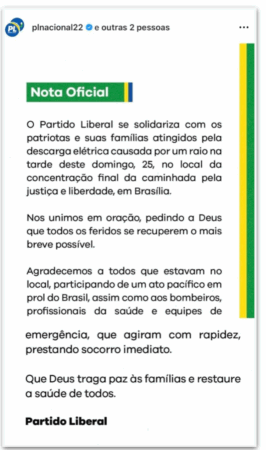 O partido do deputado envolvido na liderança do ato também se manifestou, publicando uma nota de solidariedade às vítimas e suas famílias, reconhecendo a rapidez dos serviços de emergência que atenderam a situação.