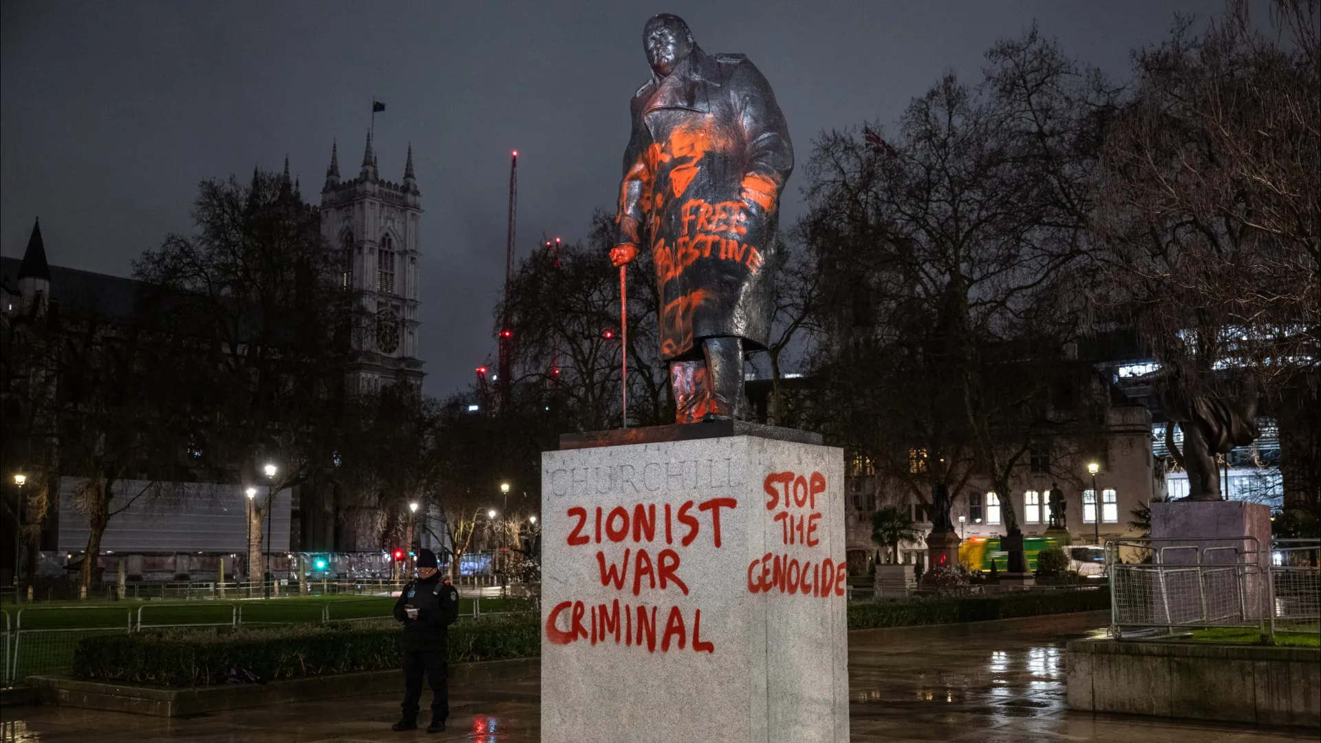 Estátua de Churchill em Londres é vandalizada com a inscrição “Criminoso de guerra”