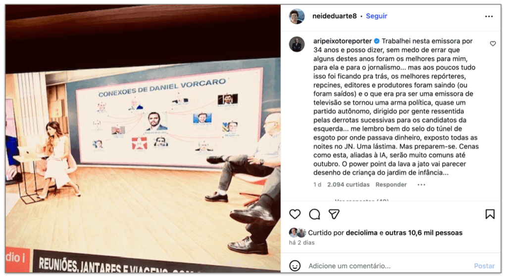 A jornalista Andréia Sadi, responsável pela retratação, afirmou que o conteúdo estava “errado e incompleto”. Ela destacou que o diagrama misturava contatos institucionais com relações pessoais, além de incluir nomes sob investigação, sem um critério claro para a escolha das informações.