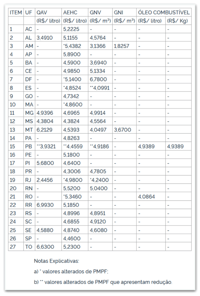 A tabela de preços abrange diferentes tipos de combustíveis, incluindo querosene de aviação (QAV), álcool etílico hidratado combustível (AEHC), gás natural veicular (GNV), gás natural industrial (GNI) e óleo combustível. Esses valores são fundamentais para a regulamentação e tributação do setor.