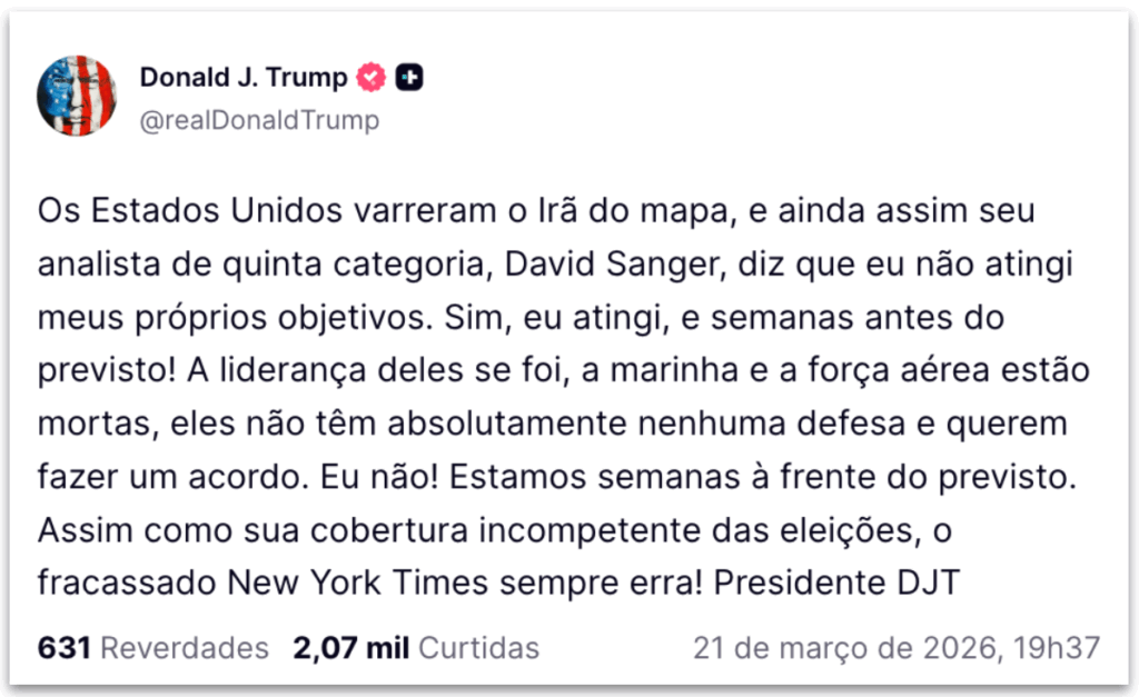 A declaração de Trump foi uma resposta a comentários do jornalista David Sanger, que indicou que Washington está considerando o fim do conflito com o Irã, mesmo sem ter alcançado todos os seus objetivos militares. Sanger destacou que, apesar da morte do aiatolá Ali Khamenei, a Guarda Revolucionária do Irã ainda mantém o controle sob a liderança de Mojtaba Khamenei, que sucedeu seu pai.