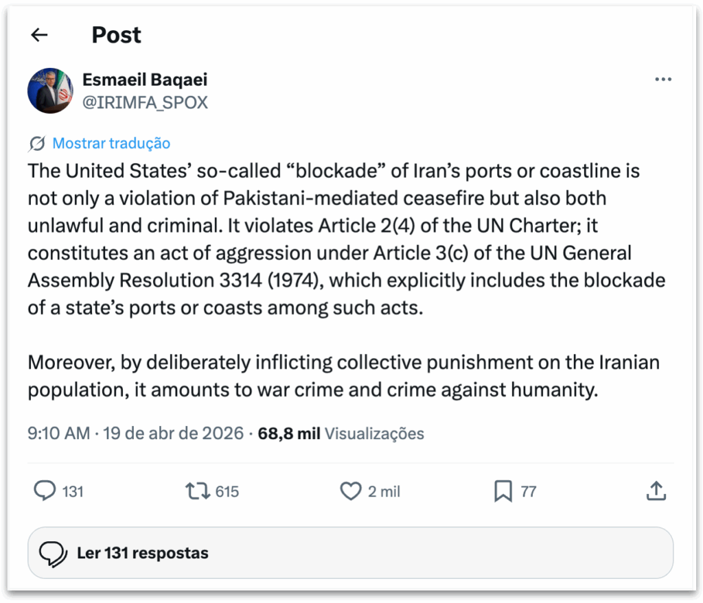 Esmaeil Baqai qualificou o bloqueio naval imposto pelos EUA como uma violação do cessar-fogo mediado pelo Paquistão. Em uma declaração feita em uma rede social, ele ressaltou que essa medida não apenas infringe acordos estabelecidos, mas também representa uma ação criminosa.