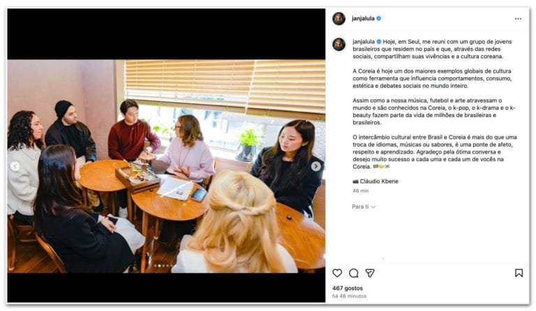 Na sexta-feira, 20 de fevereiro de 2026, Janja se encontrou com um grupo de jovens brasileiros que vivem na Coreia e atuam como influenciadores nas redes sociais. Essa reunião visa fortalecer laços culturais e promover a interação entre as duas nações.