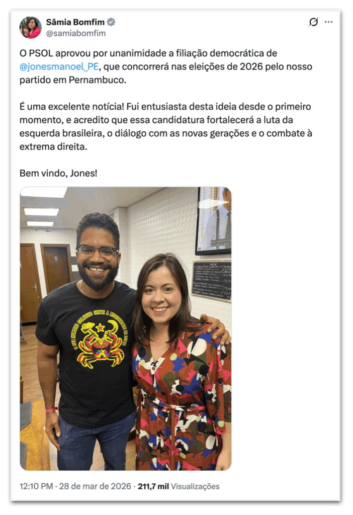 A presidente do PSOL, Paula Coradi, tem como meta eleger a maior bancada federal da história da sigla e espera que Jones Manoel se torne o primeiro deputado federal do partido no Nordeste. Em Pernambuco, o PSOL também conta com Ivan Moraes como pré-candidato ao governo do Estado, ampliando suas opções eleitorais na região.