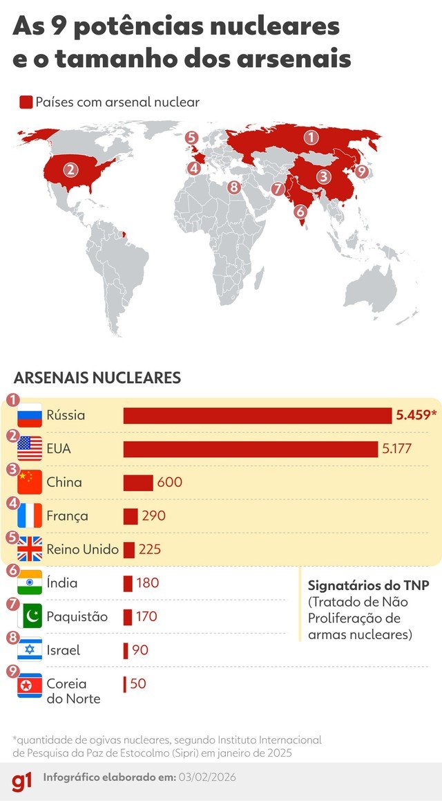 Essas duas nações concentram cerca de 90% das ogivas nucleares globais. Com o vencimento do tratado New START, não há mais um acordo em vigor que imponha limites aos arsenais nucleares de ambos os países, o que pode levar a uma nova corrida armamentista.