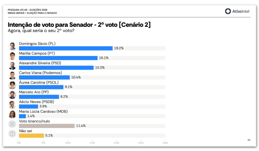 Em um segundo cenário apresentado, a disputa continua acirrada, com Marília Campos alcançando 20,6% e Carlos Viana 18%. A pesquisa também explorou as intenções de voto para o primeiro e segundo voto neste novo cenário, onde Viana obteve 25,6% e Campos 25,2% no primeiro voto, e Sávio novamente se destacou no segundo voto.
