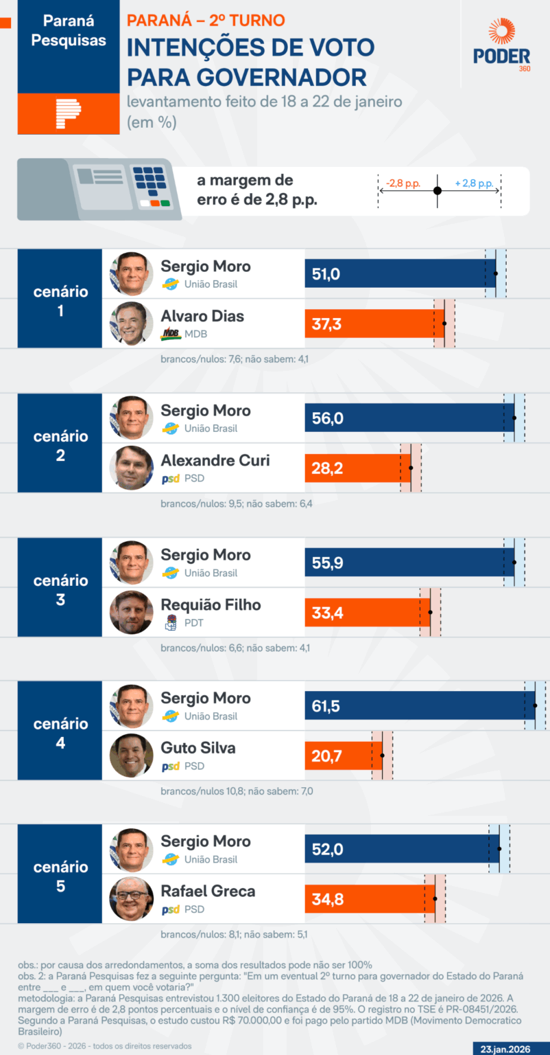Recentes pesquisas indicam que Sergio Moro lidera a disputa pelo governo do Paraná em diversos cenários. Levantamentos realizados em janeiro mostraram que, em todos os cenários testados, Moro se destacava como o favorito para vencer tanto no primeiro quanto no segundo turno das eleições.