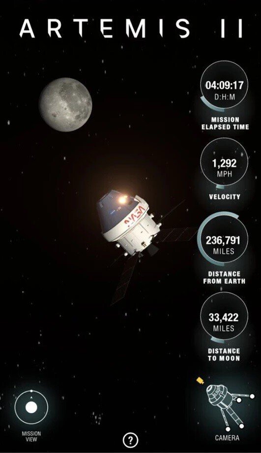 Além disso, o site oferece atualizações em tempo real, incluindo o tempo decorrido desde o início da missão, a velocidade da espaçonave, sua distância da Terra e sua distância da Lua.