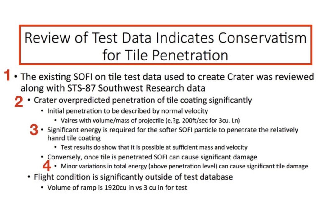 Os dois últimos pontos do slide indicavam que os testes preliminares não refletiam a realidade do impacto. A própria NASA reconheceu, em um relatório após a investigação, que havia se baseado excessivamente na apresentação em PowerPoint.