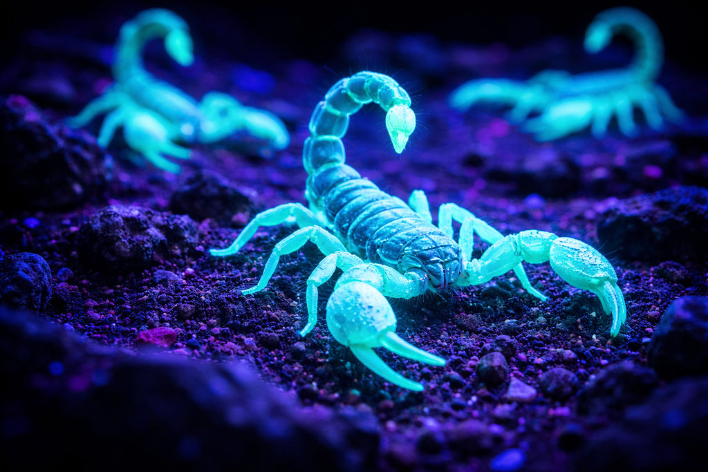 Os escorpiões são os “garotos-propaganda” desse fenômeno. Eles possuem uma camada muito fina e resistente em seu exoesqueleto chamada camada hialina. É essa parte da “armadura” que reage à luz ultravioleta, fazendo-os brilhar em um tom azul-esverdeado fantasmagórico.