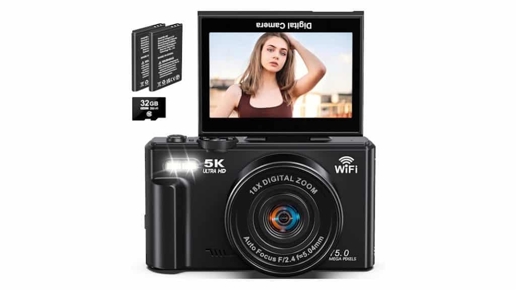 A câmera digital 5K se destaca por sua capacidade de capturar imagens com 75 megapixels e gravar vídeos em 5K. Com um foco que acompanha o movimento e uma tela traseira que se vira para facilitar o enquadramento, ela ainda possui Wi-Fi integrado para envio direto das fotos para o celular.