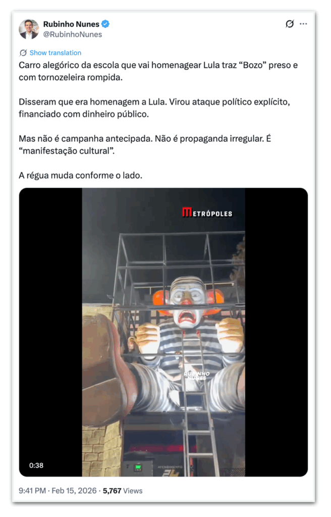 Flávio Bolsonaro, senador e pré-candidato à presidência, divulgou um vídeo em sua rede social que utiliza inteligência artificial para criticar o evento. Nele, aparecem carros alegóricos com Lula e o ex-líder venezuelano Nicolás Maduro, acompanhado de uma trilha sonora que faz referências à primeira-dama Janja e acusações sobre o uso indevido de recursos públicos.