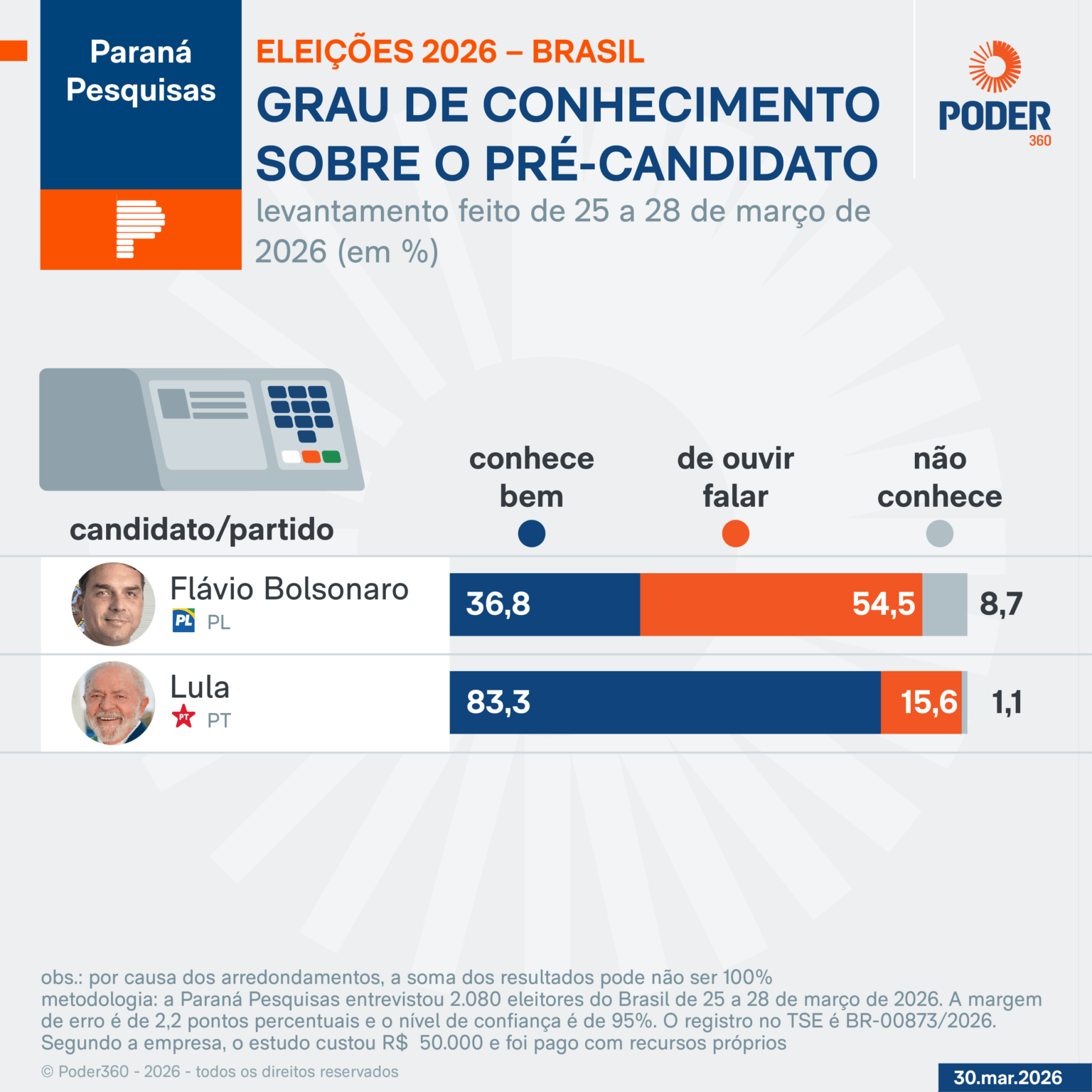 A pesquisa foi realizada com 2.080 eleitores em todo o Brasil, apresentando uma margem de erro de 2,2 pontos percentuais e um nível de confiança de 95%. O custo do estudo foi de R$ 50.000, financiado com recursos próprios.