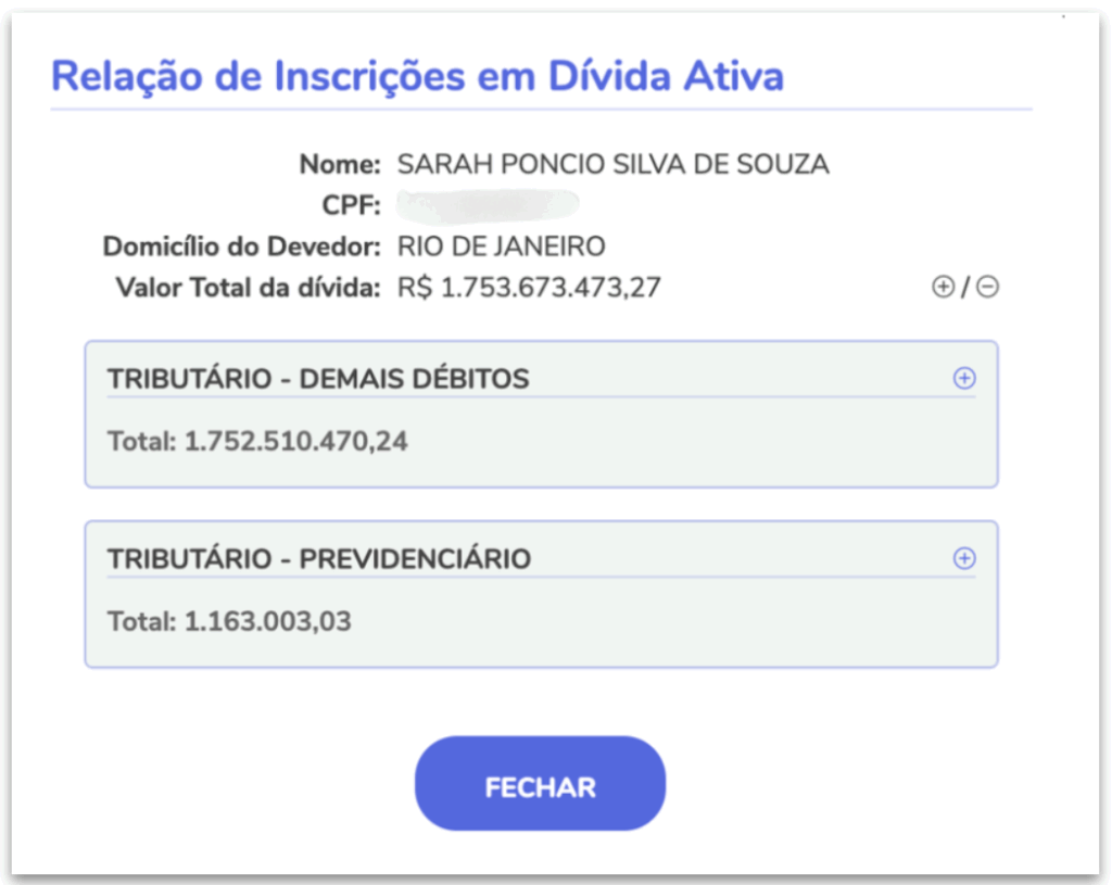 A Procuradoria Geral da Fazenda Nacional identificou débitos tributários que somam R$ 1,75 bilhão em nome da deputada estadual Sarah Poncio. A parlamentar, que faz parte do partido Solidariedade no Rio de Janeiro, negou ter qualquer dívida de impostos com a União.