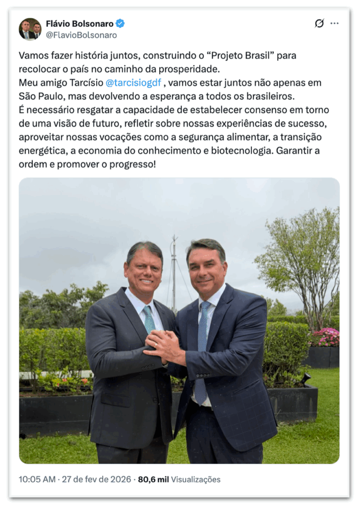 O encontro entre Flávio e Tarcísio aconteceu no Palácio dos Bandeirantes, sede do governo paulista. Após a reunião, Flávio compartilhou uma foto ao lado de Tarcísio em suas redes sociais, ressaltando a parceria para o “Projeto Brasil”, que visa recolocar o país no caminho da prosperidade.