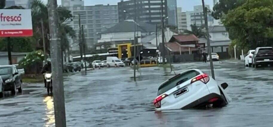 Em Capão da Canoa, no Litoral Norte gaúcho, uma situação crítica ocorreu quando um carro caiu em uma vala aberta pela força da água, refletindo os alagamentos que afetaram diversas ruas da cidade.