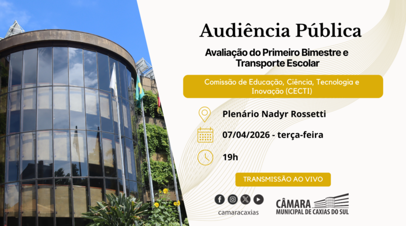 A Câmara de Vereadores de Caxias do Sul realiza, nesta terça-feira (7), uma audiência pública para discutir o transporte escolar no município. O encontro ocorre às 19h, no plenário do Legislativo, sob condução da Comissão de Educação.