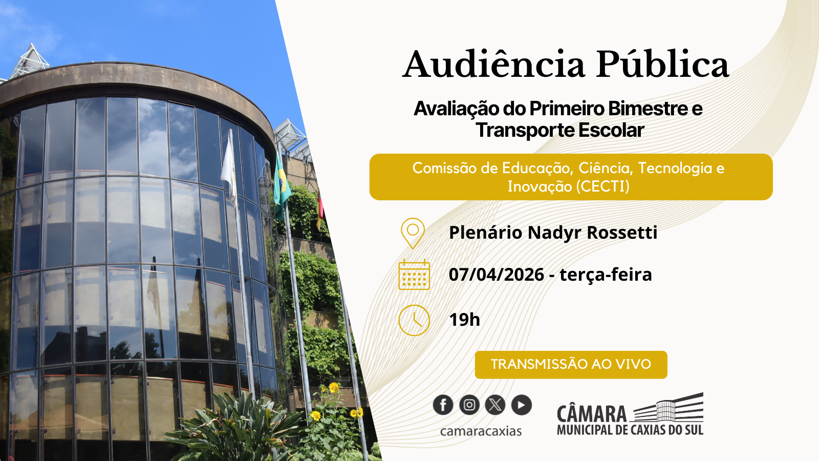 A reunião será aberta ao público e contará com transmissão ao vivo pelos canais oficiais da Câmara Municipal.