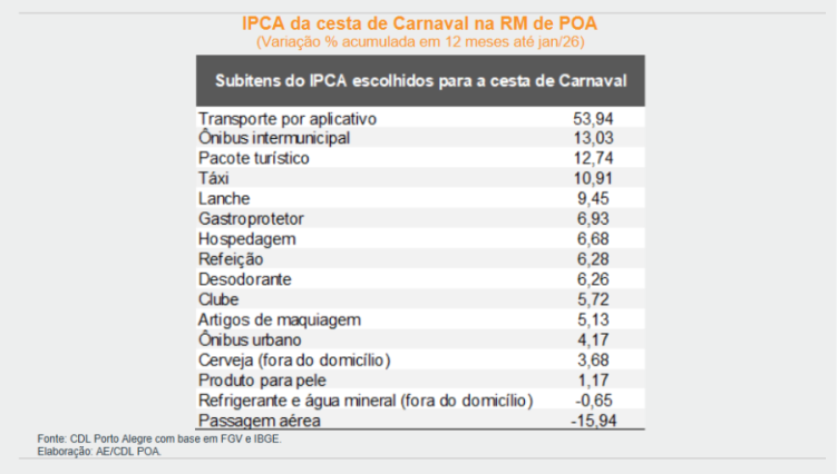 A inflação do carnaval, que se refere a uma cesta de 16 itens típicos da celebração, apresentou um aumento significativo de 5,8% em todo o Brasil e 6,2% na Região Metropolitana de Porto Alegre, considerando os últimos 12 meses até janeiro de 2026.