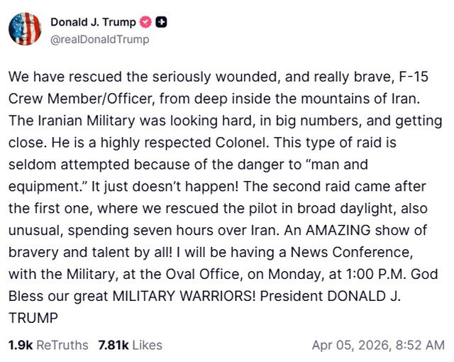 Após a operação, o piloto foi levado para o Kuwait para receber tratamento médico. A missão de resgate ocorreu sob intenso tiroteio, com o Irã alegando ter destruído várias aeronaves dos EUA que participaram da operação. Contudo, Trump e a mídia americana afirmam que todas as tropas conseguiram sair do território iraniano em segurança.