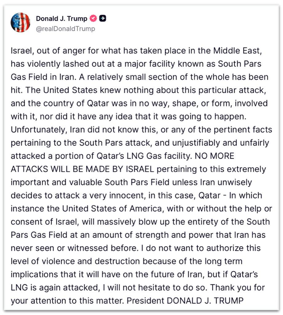 Ele também expressou preocupação com as consequências de um ataque ao Qatar, afirmando que, se a infraestrutura de gás natural liquefeito (GNL) do país for ameaçada novamente, os Estados Unidos reagirão com força significativa.
