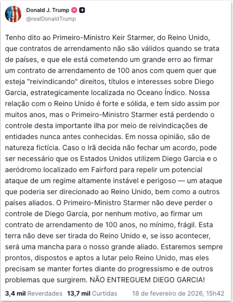 Na mesma publicação, o presidente criticou o primeiro-ministro britânico, afirmando que a decisão de entrar em um arrendamento de longo prazo poderia ser prejudicial para a relação entre os dois países. Ele ressaltou que a soberania sobre a ilha não deve ser transferida e que isso poderia manchar a imagem do Reino Unido como aliado dos EUA.