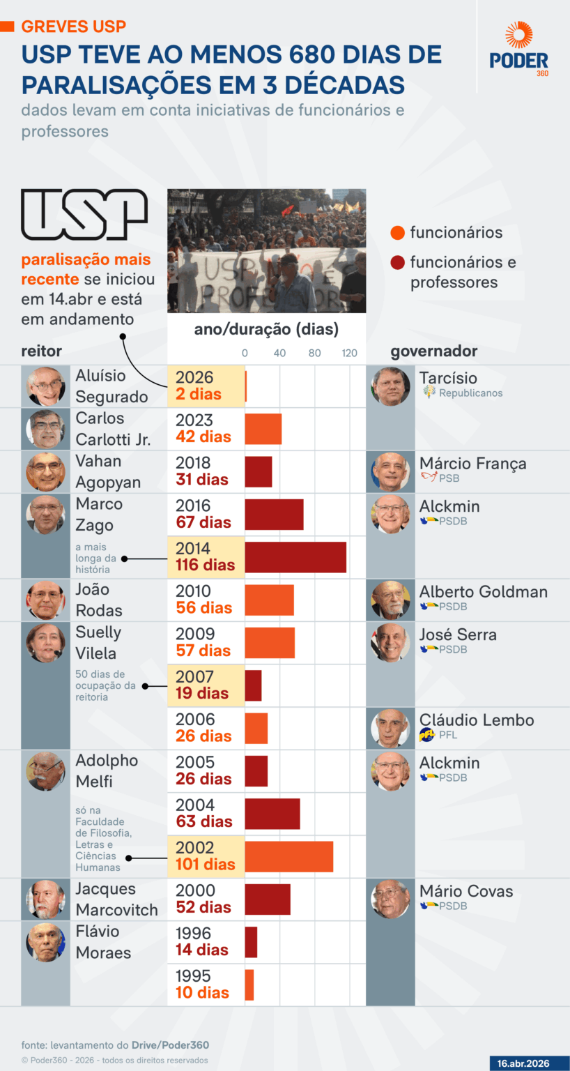 Desde 1995, a Universidade de São Paulo (USP) enfrentou ao menos 680 dias de paralisação de docentes e funcionários, refletindo demandas históricas por melhores salários e a contratação de professores.