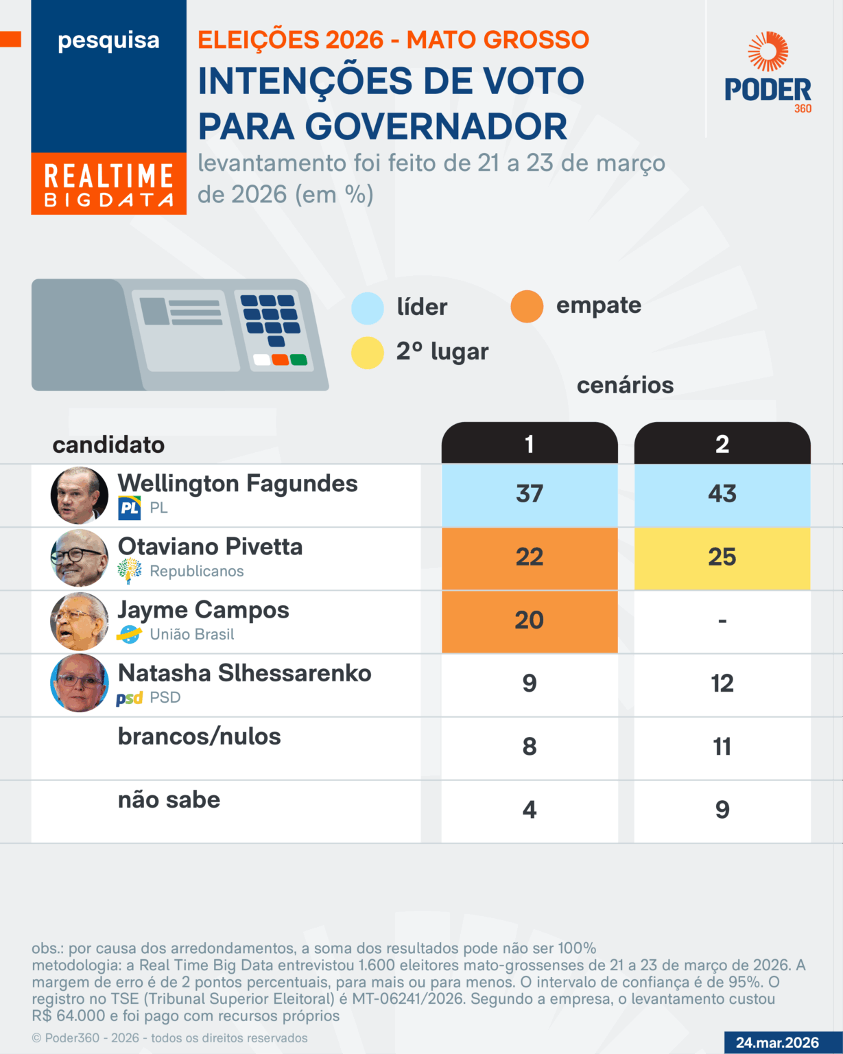 O levantamento foi realizado pela Real Time Big Data e divulgado em 24 de março de 2026. A pesquisa apresentou oito diferentes cenários de disputa, todos indicando a liderança de Fagundes nas intenções de voto. Esse desempenho reflete a sua popularidade e apoio entre os eleitores mato-grossenses.