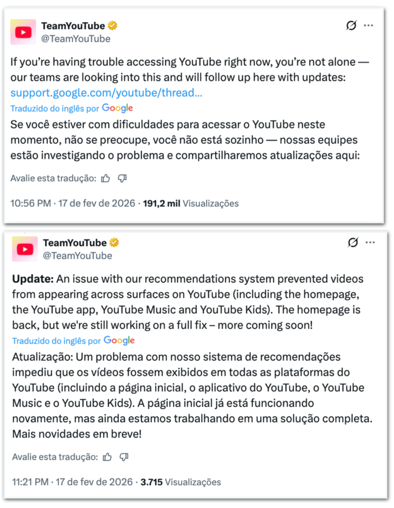 Na noite de terça-feira, 17 de fevereiro de 2026, o YouTube passou por uma série de falhas que afetaram usuários em diversas partes do mundo.